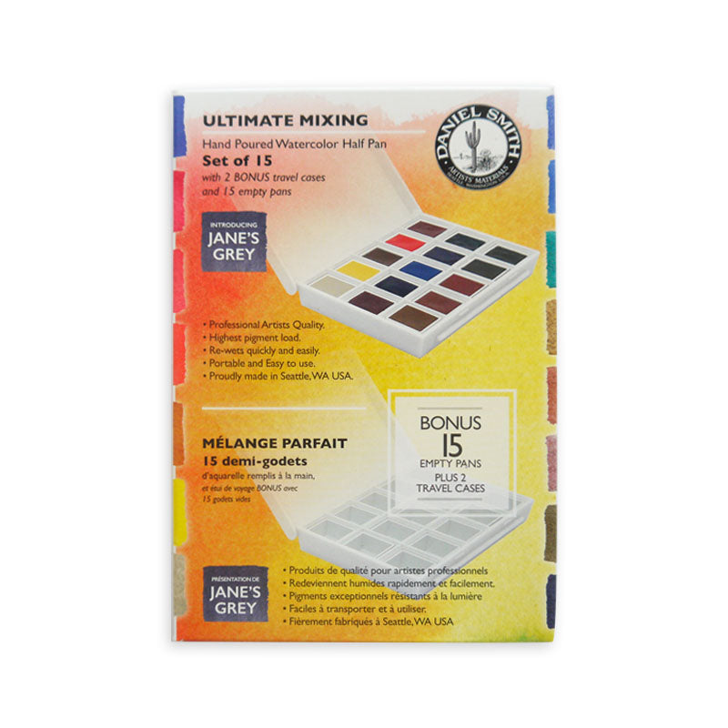 Ultimate Mixing Hand Poured Watercolor Half Pan Set has 4 unique* DANIEL SMITH colors, including our NEW Jane’s Grey, plus 12 more colors for a complete mixing set. The challenging process of selecting a useful, versatile range of paints has been done!