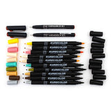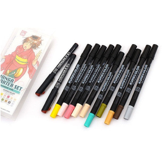 The set includes two Mangaka fineliners, ten double-sided Kurecolor colored markers with fine and brush tips, a template for tracing the outline of the character, and a how-to guide for coloring and highlights.