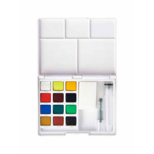 This compact travel kit offers 12 assorted half-pan colors, a refillable 4 ml water brush, a sponge, and convenient mixing wells molded in the cover. The set measures 4½''H × 3½''W × 1''D and weighs 4 oz.