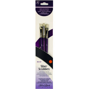 Silver Scrubbers™ are good for any type of paint and on any surface including canvas, board, paper, fabric, furniture, walls and more. All brushes are an extra stiff white synthetic available in 5 different 3pc sets.