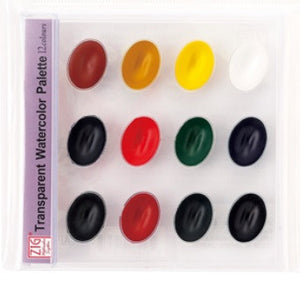 Contents: One (1) 3-7/8 x 3-7/8 inch case with twelve watercolor paints - Brown, Yellow Ochre, Lemon Yellow, White, Violet, Vermilion, Grass Green, Blue, Black, Carmine Red, Deep Green, Prussian Blue